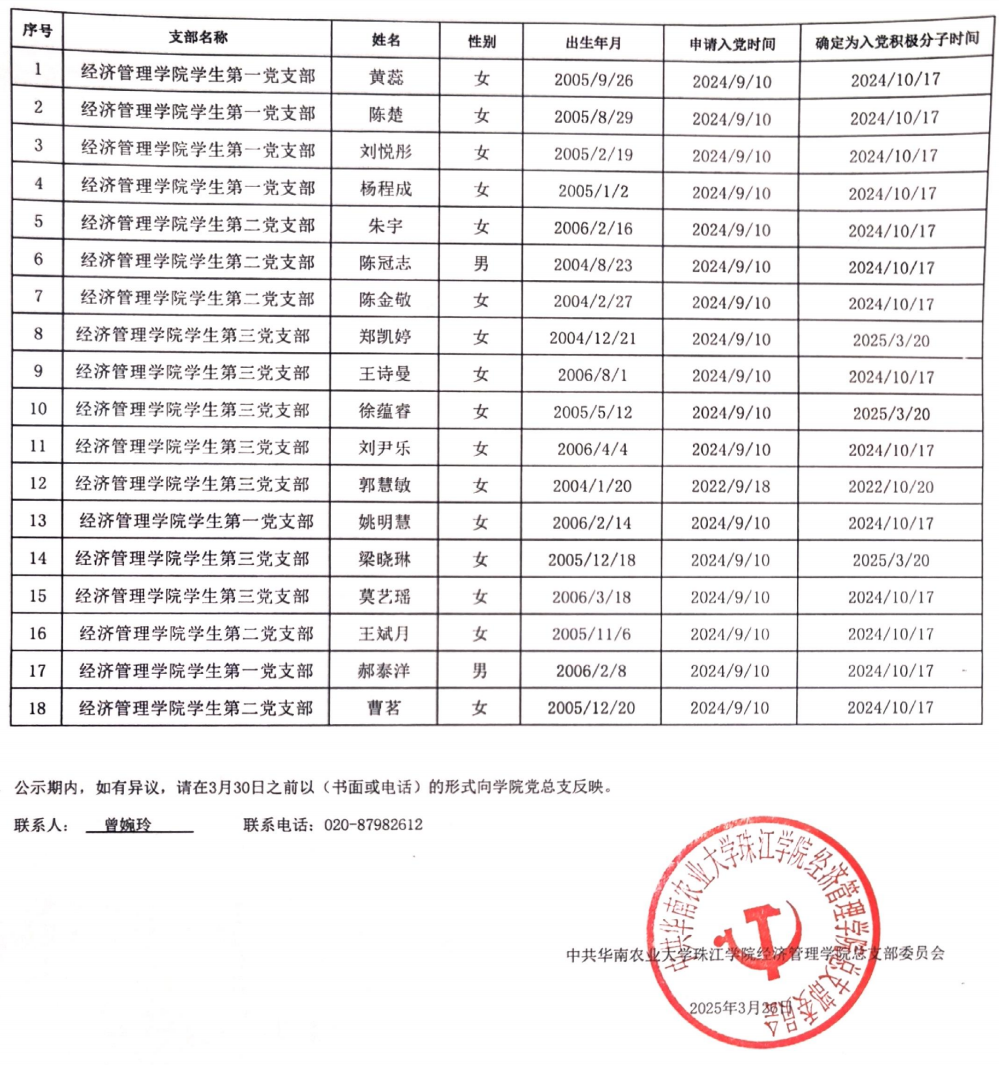 经组织考察和研究,拟近期讨论接收黄蕊等18位同志拟确定为发展对象,现将黄蕊等18位同志有关情况公示如下,公示时间为3月26日-3月30日共5天。