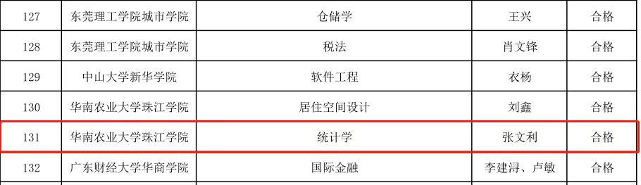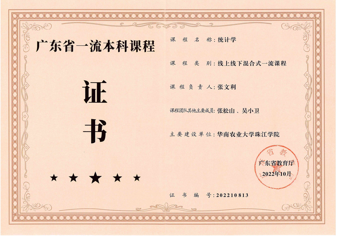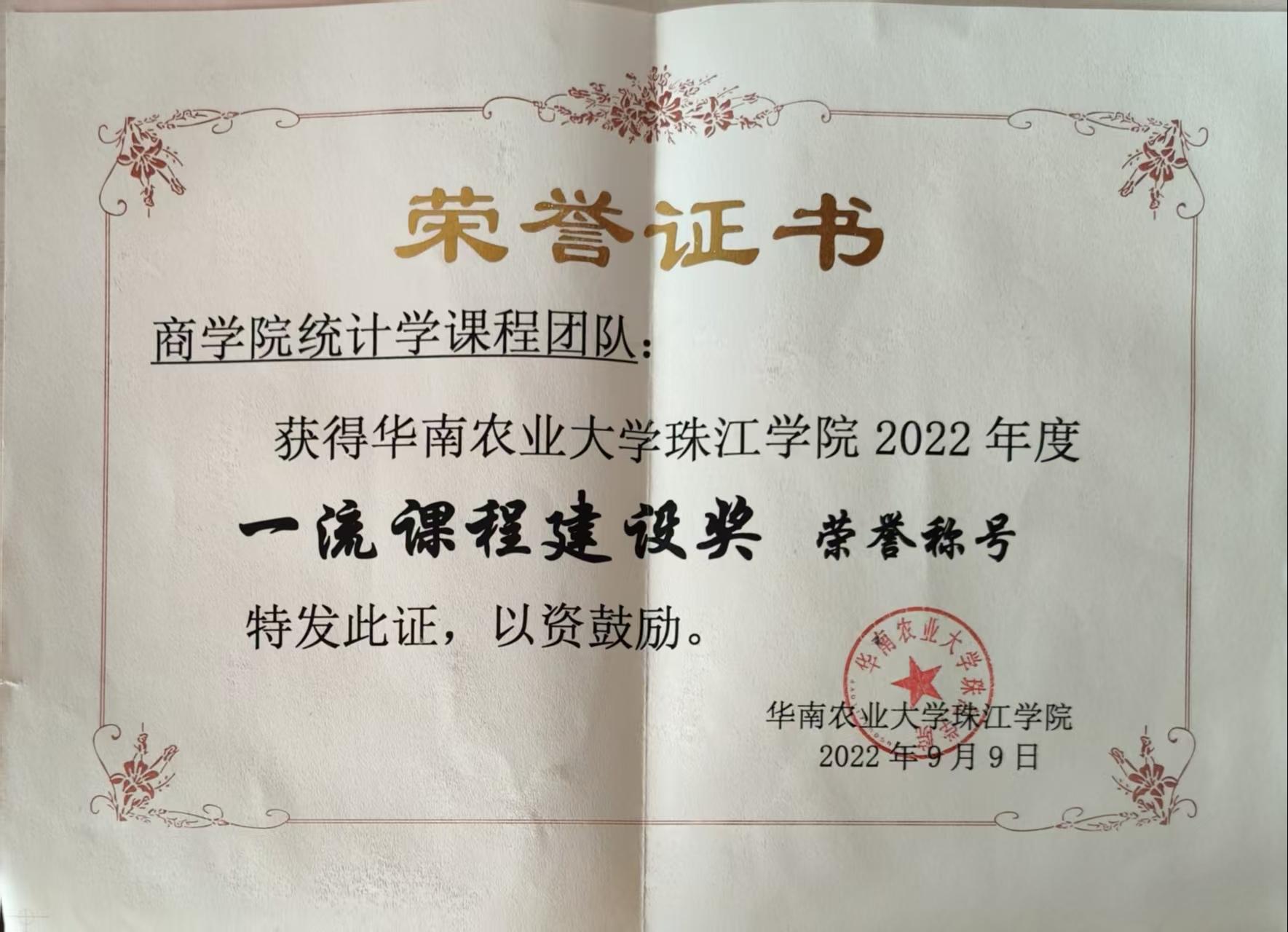 《统计学》课程2015年获广东省教育厅教学质量与教学改革工程立项(粤教高函[2015]133号),2020年6月获广东省教育厅程验收通过(粤教高函[2020]9号);2022年5月获批广东省一流本科课程(粤教高函([2022] 10号);2022年9月《统计学》课程团队获华南农业大学珠江学院2022年度“一流课程建设奖”荣誉称号。